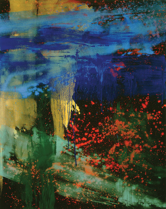 Makoto Fujimura, “Water Flames” (detail), 2011. From The Four Holy Gospels. Mako: “The Son of Man walks into the flames of judgment reserved for us. Jesus turns the judgment flames into sanctifying flames, like the gold pigments used for this painting, as the heat takes out the dross.”
