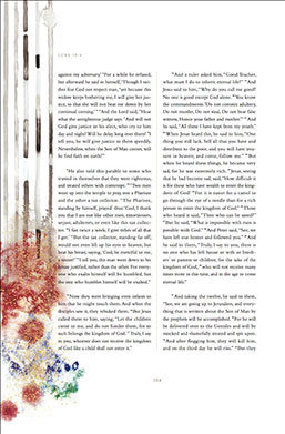 You won’t find a representational image of the Crucifixion anywhere in this Bible, but you will find subtle references to Christ’s saving work throughout. For example, in the marginal painting that accompanies the parable of the Pharisee and the tax collector, Mako uses a series of straight lines to represent the letter of God’s old-covenant laws, which the Pharisees strove to uphold so rigidly. But at the bottom of these lines you see an explosion of color, which illustrates the effect of Christ’s death on the law—which was to reinterpret it in such a way that it burst open the lines and revealed, incarnationally, their true spirit. Mako describes it as “grace that flows out of the Laws of God—boundless, explosive, and playful.” A grace that confounds and overwhelms.