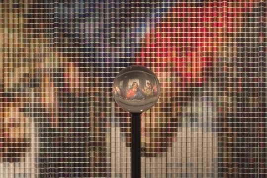To create this piece, Sperber strung over 20,000 spools of thread in adjacent columns to create an inverted abstraction of Leonardo’s Last Supper. When viewed with the naked eye, the work just looks like a bunch of obliquely hung spools. (From farther away, one can start to see the image, but it’s upside down.) But when seen through the viewing sphere, the abstracted image is rotated 180 degrees, its “pixels” shrunk and condensed into a recognizable image. That’s optics for you.