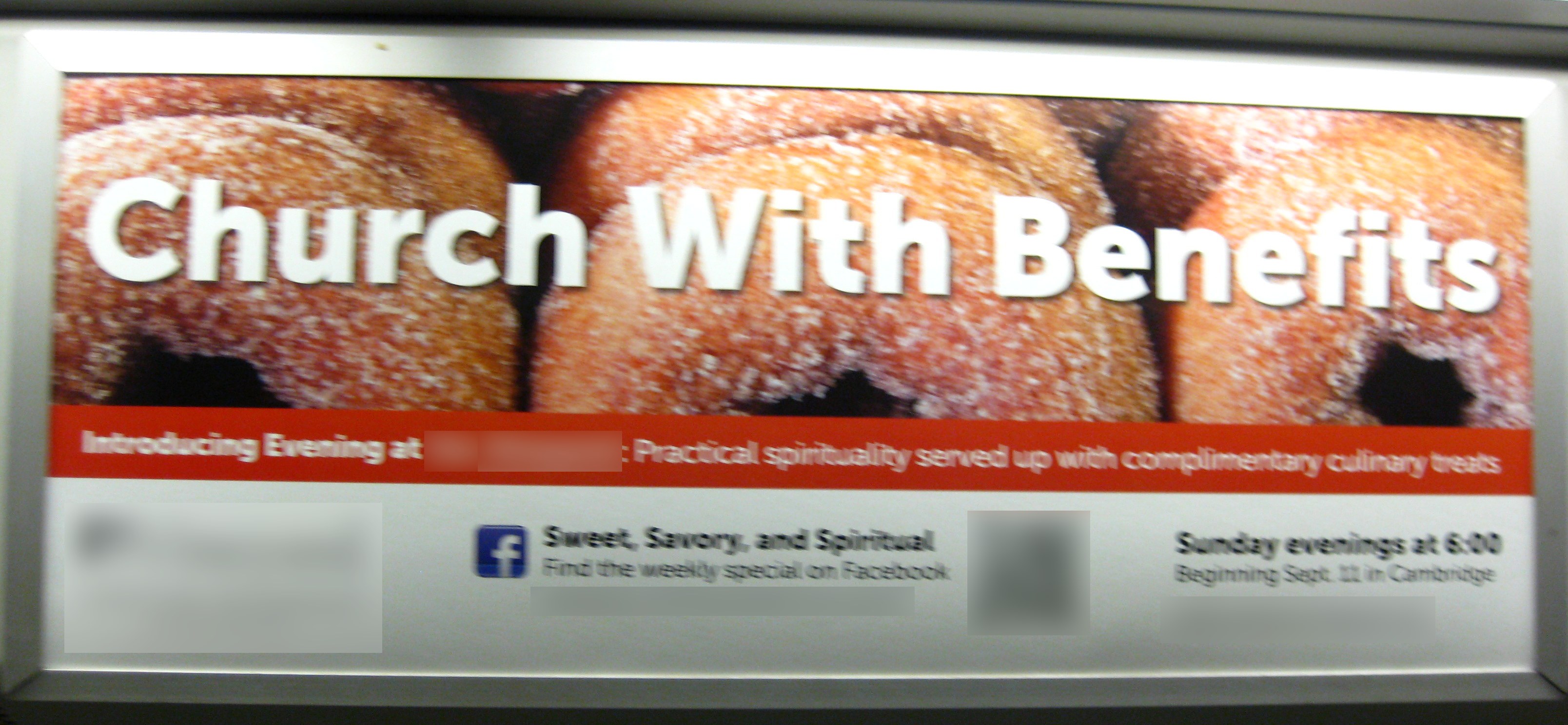 I took this photo on the Boston Red Line subway last October. I blurred out the church name because I’m not so much criticizing the church as this ad campaign. The ad copy reads: “Church With Benefits: Practical spirituality served up with complimentary culinary treats.”