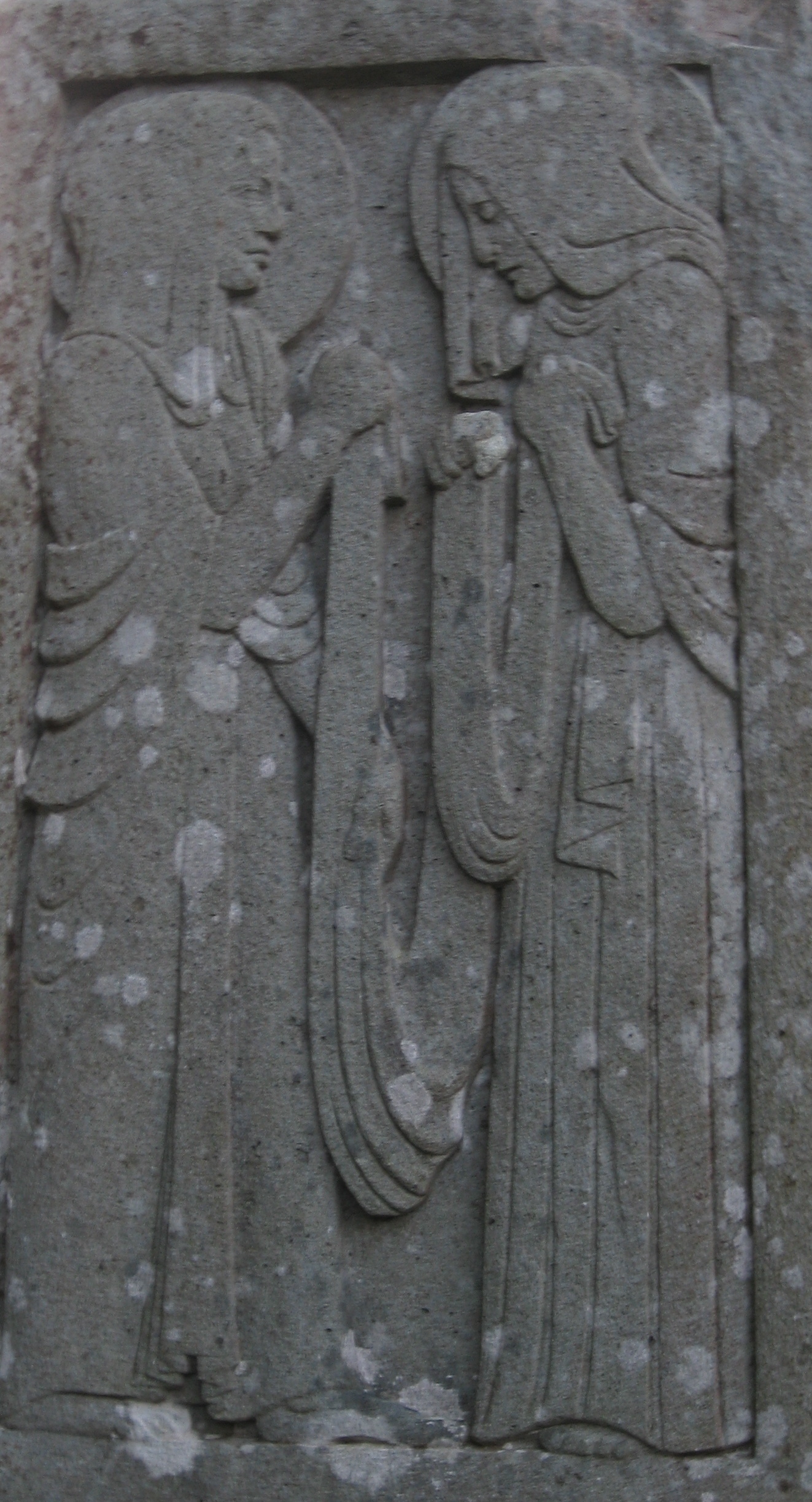 I can’t tell what the other three scenes are. The second one from the top looks like the Visitation (of the pregnant Mary with her cousin Elizabeth), and the bottom one looks like a fallen angel—but I’m not sure what particular relevance those stories would have to this deceased individual; they seem odd choices for a funerary monument. My husband suggested that maybe the bottom panel shows an angel swooping down to fetch the soul of the deceased and bring it up to God . . . which seems more reasonable.