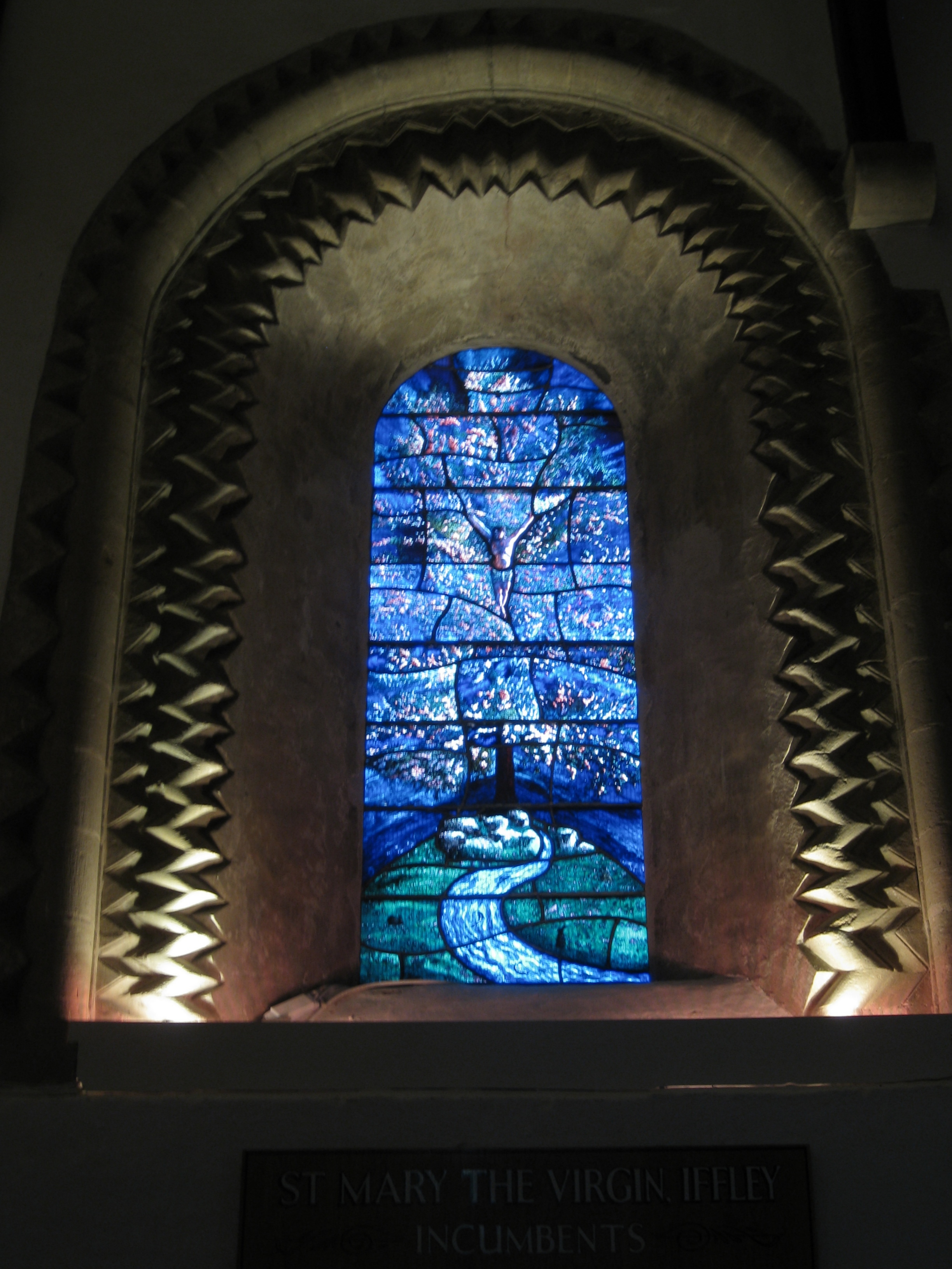 When you enter the church, immediately to your right is the South Window, designed by John Piper (the late English stained glass artist, not the American Christian author and speaker associated with DesiringGod.org!) and made by David Wasley. It was created in 1982 for an exhibition in Bristol and installed in St. Mary’s Iffley in 1995 after being gifted to the church by Piper’s widow, Myfanwy. Wasley added the blue border and the bottom inscription panel at this time so that the window would fit into the church’s original aperture.