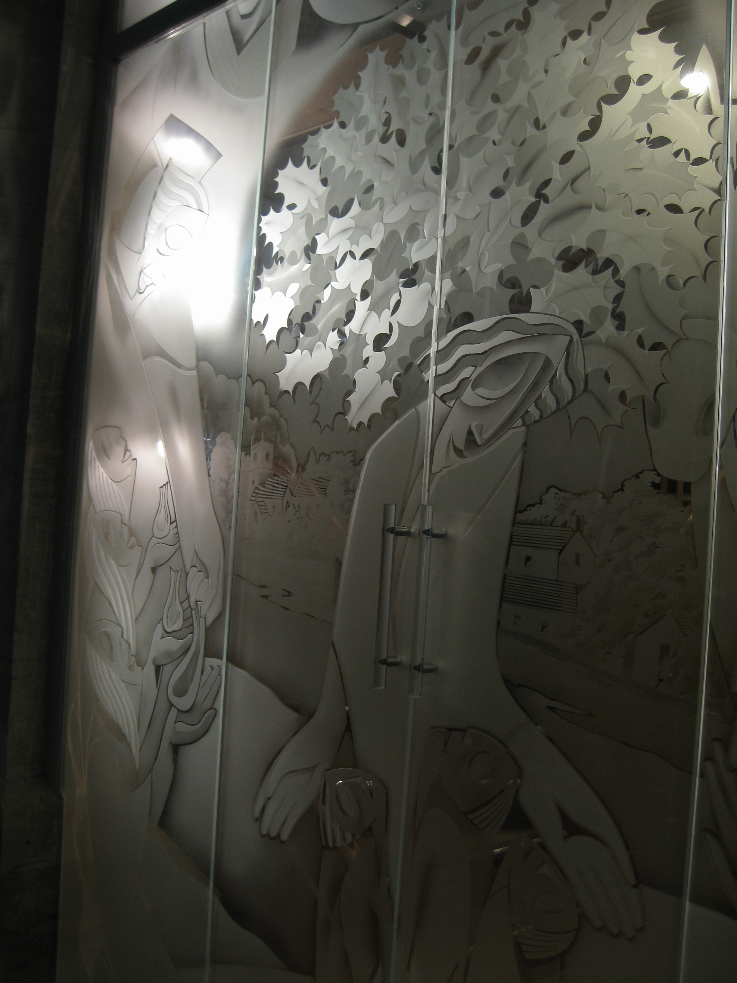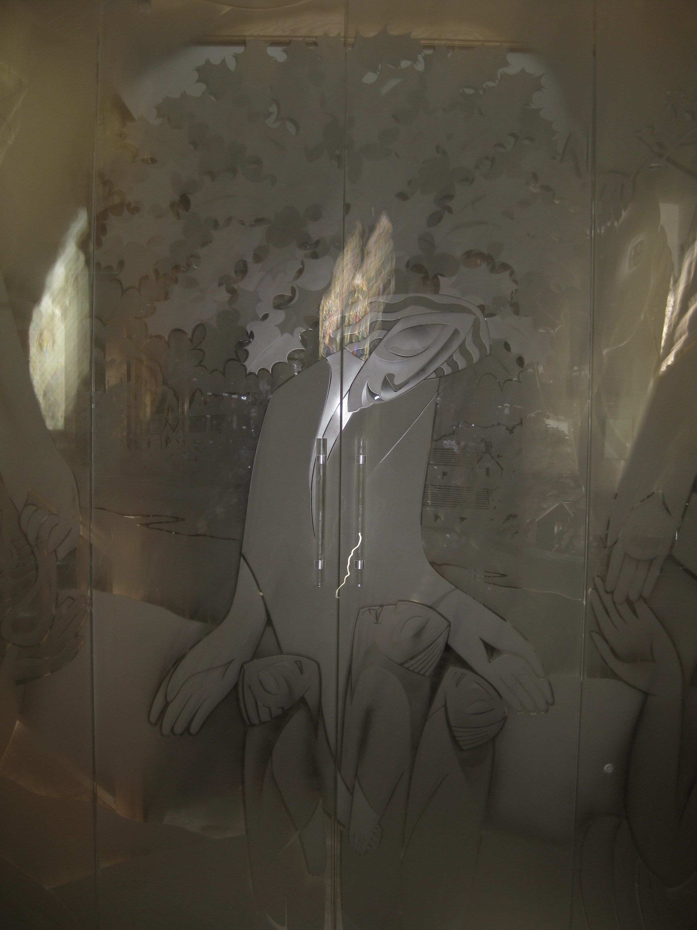 Sandblasted glass screen at the west end of the Church of St. Nicholas, Islip, Oxfordshire, England. Designed by Nicholas Mynheer and made by Davia Walmsley of Daedalian Glass, 2011.