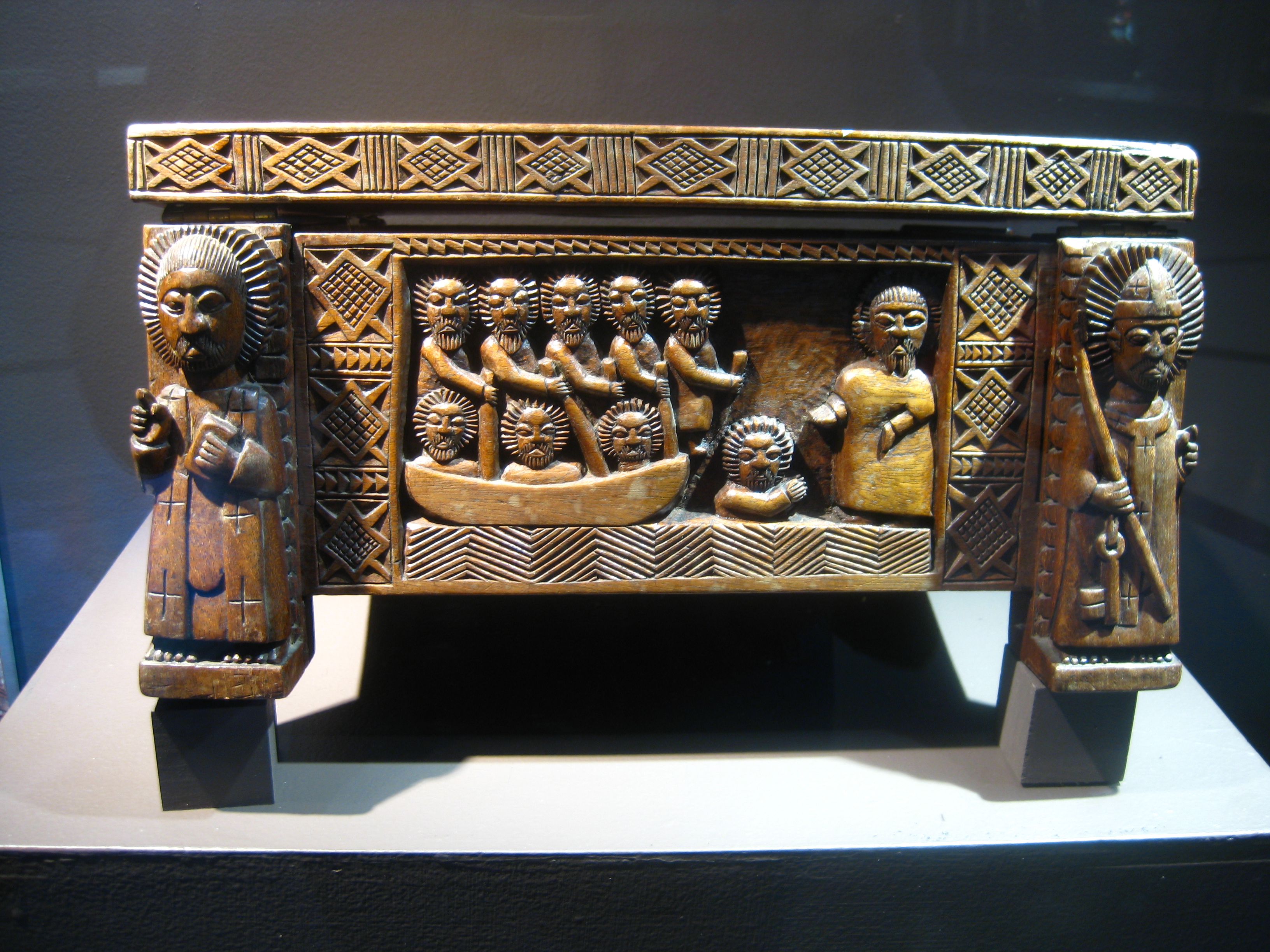Around 1950 he carved a missal stand depicting a scene of Christ walking on the water—and Peter sinking—on the front face. The other three sides show Christ giving the keys to the Church to St. Peter; the Good Shepherd; and an unidentified scene. Catholic saints stand at two of the corners, and Yoruba orishas stand at the other two.