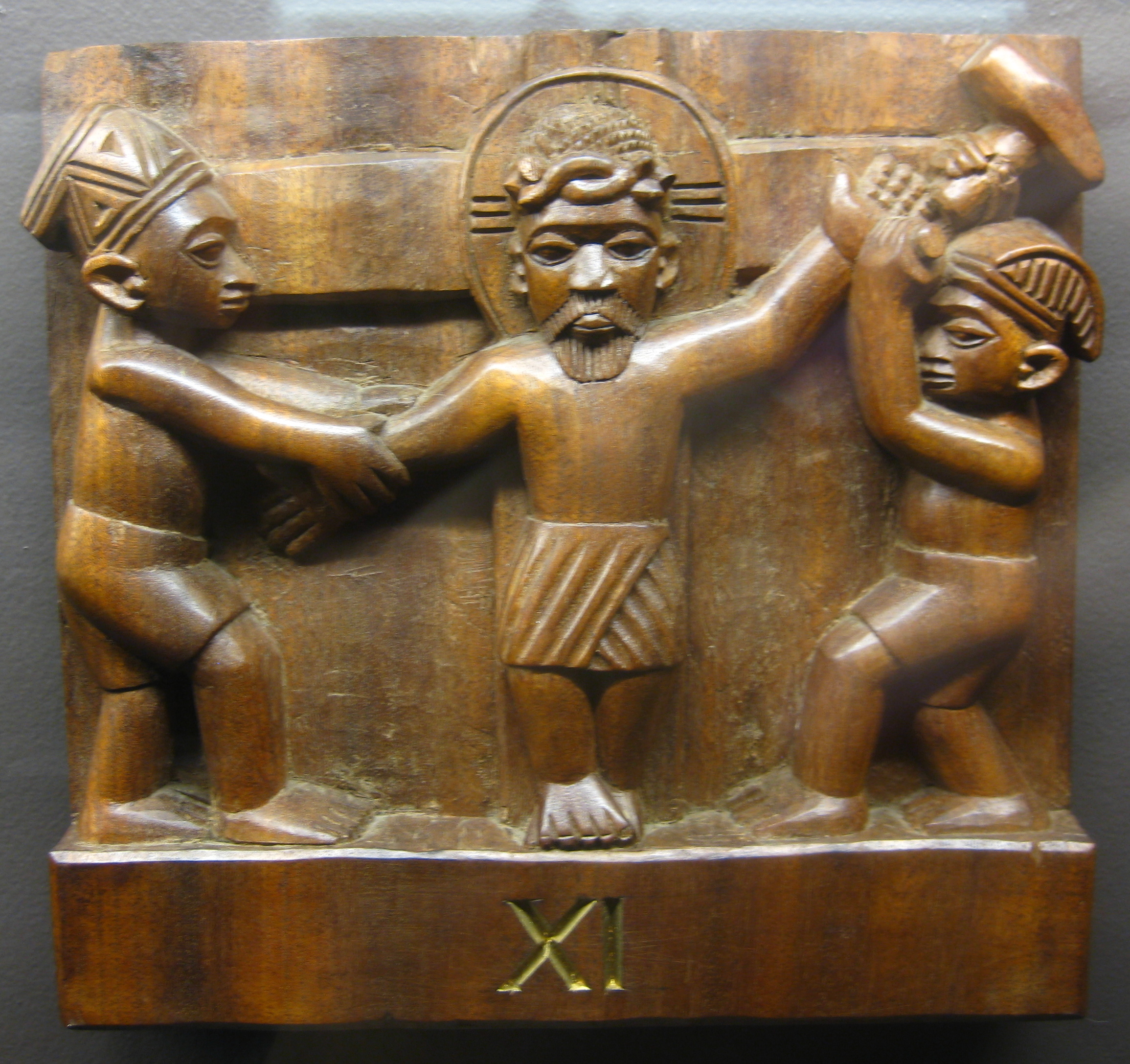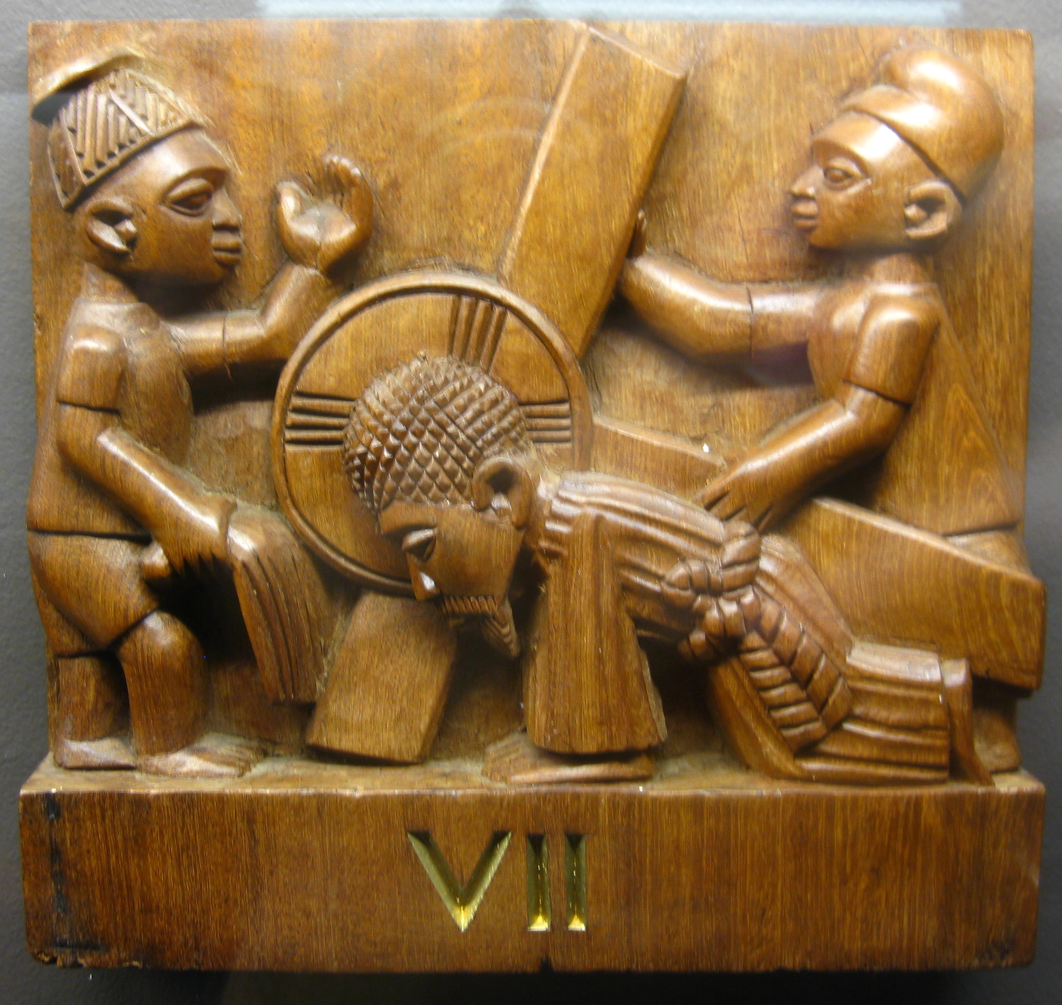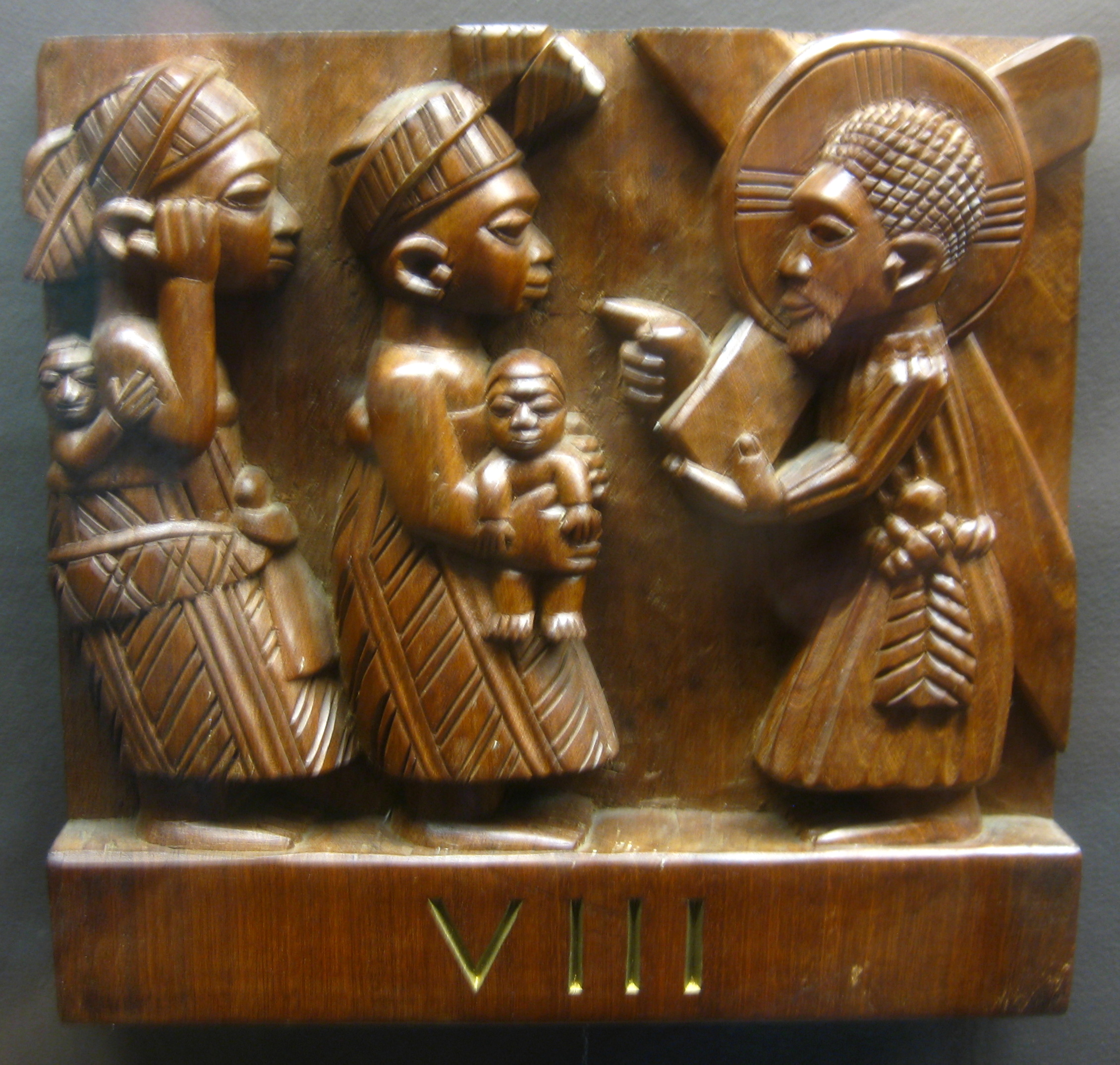 • I did some investigating and found that the book CHRISTLICHE KUNST IN AFRIKA calls this same artist Joseph Agbana, and it has a few pages of photographed works by him–Holy Family sets and carved doors, as well as a photo of him with Carroll (I can e-mail you scans if you’re interested). Bridger says Agbana was “Carroll’s favorite Yoruba carver in later years”; that he created panels on the familiar Gospel themes but with a broader range of Nigerian ethnicities present; and that (as of 2012) he and his son continue to carve in both the Yoruba-Christian and the Neo-Traditional styles in their studio in Inisha. The SMA sculpture guide I linked in the topmost caption identifies the artist as “Joseph Imale, son of Roti, the Agbana (king) of Osi IIorin” and has some additional photographs.