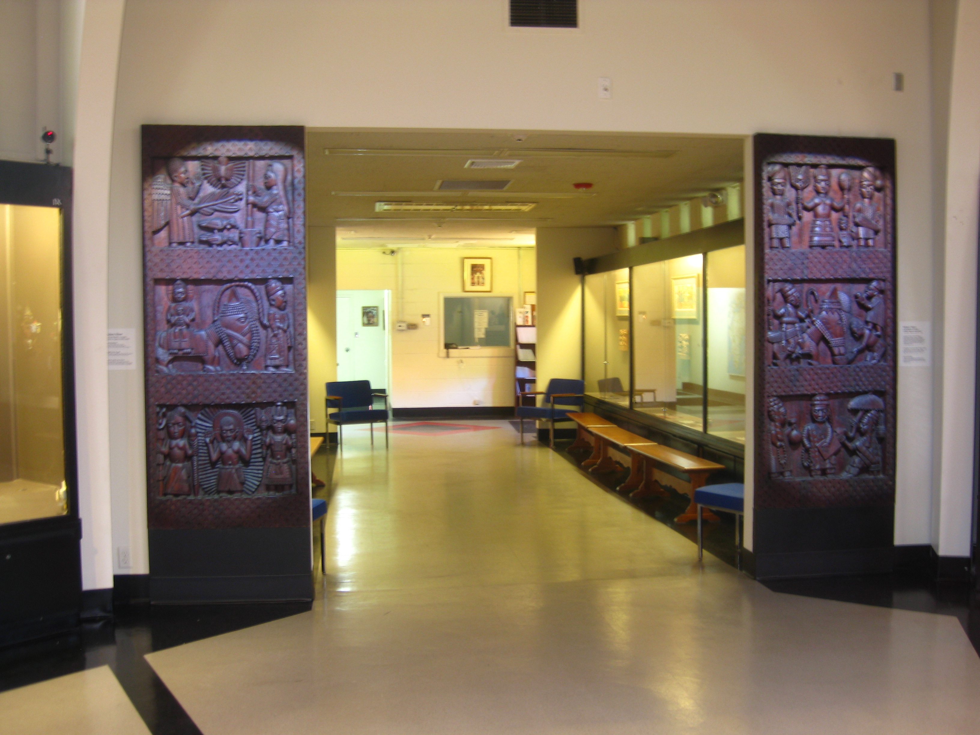 Around 1964, Carroll commissioned Bandele to carve four wooden doors specifically for the African Art Museum in Tenafly. (The doors are not for use; their backs are attached to the walls on either side of two hallway entrances.)