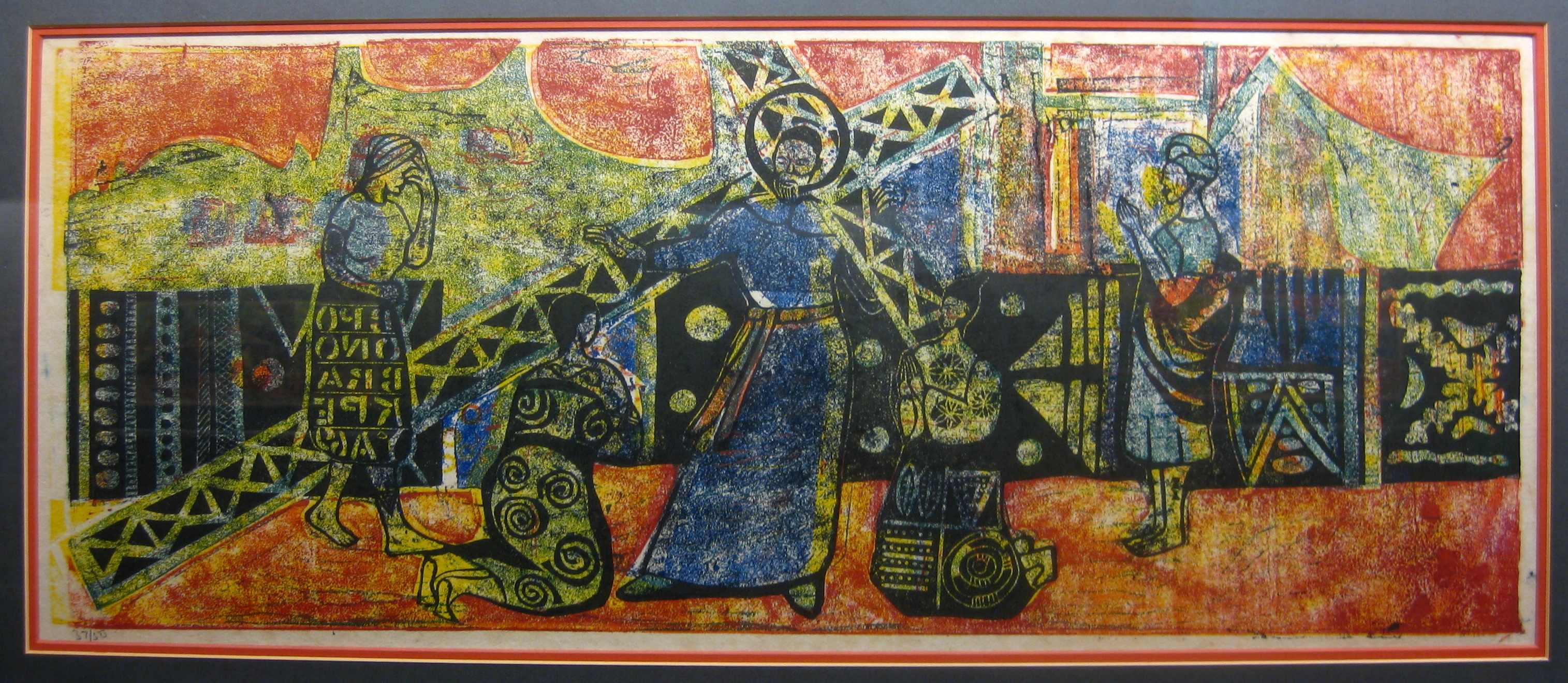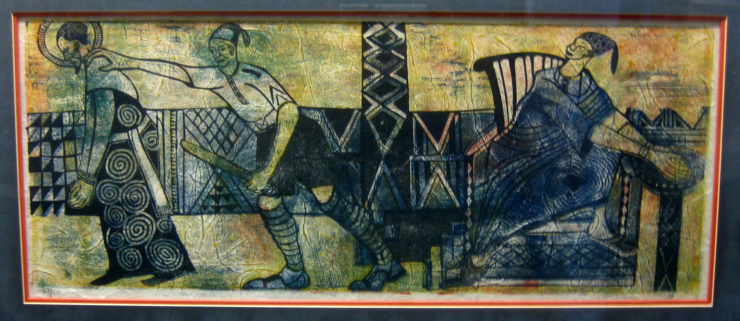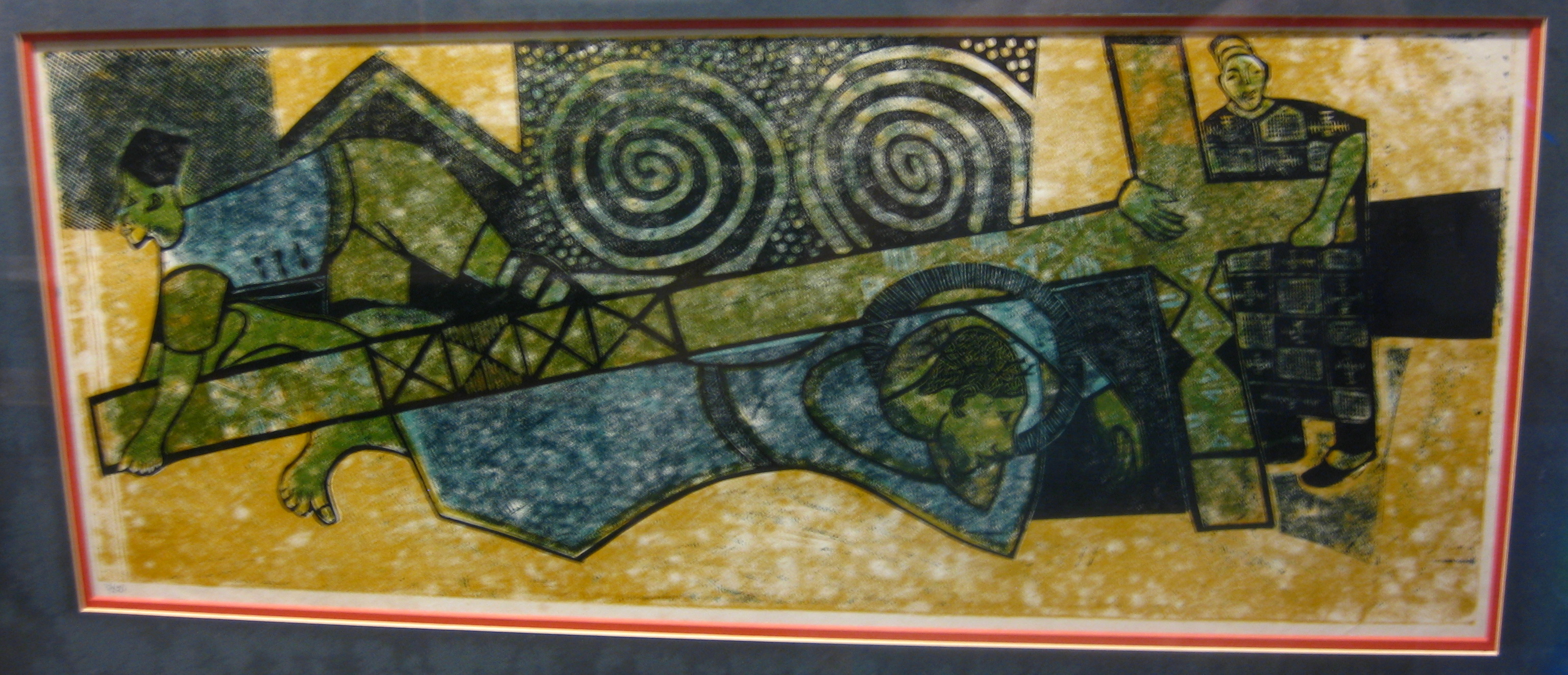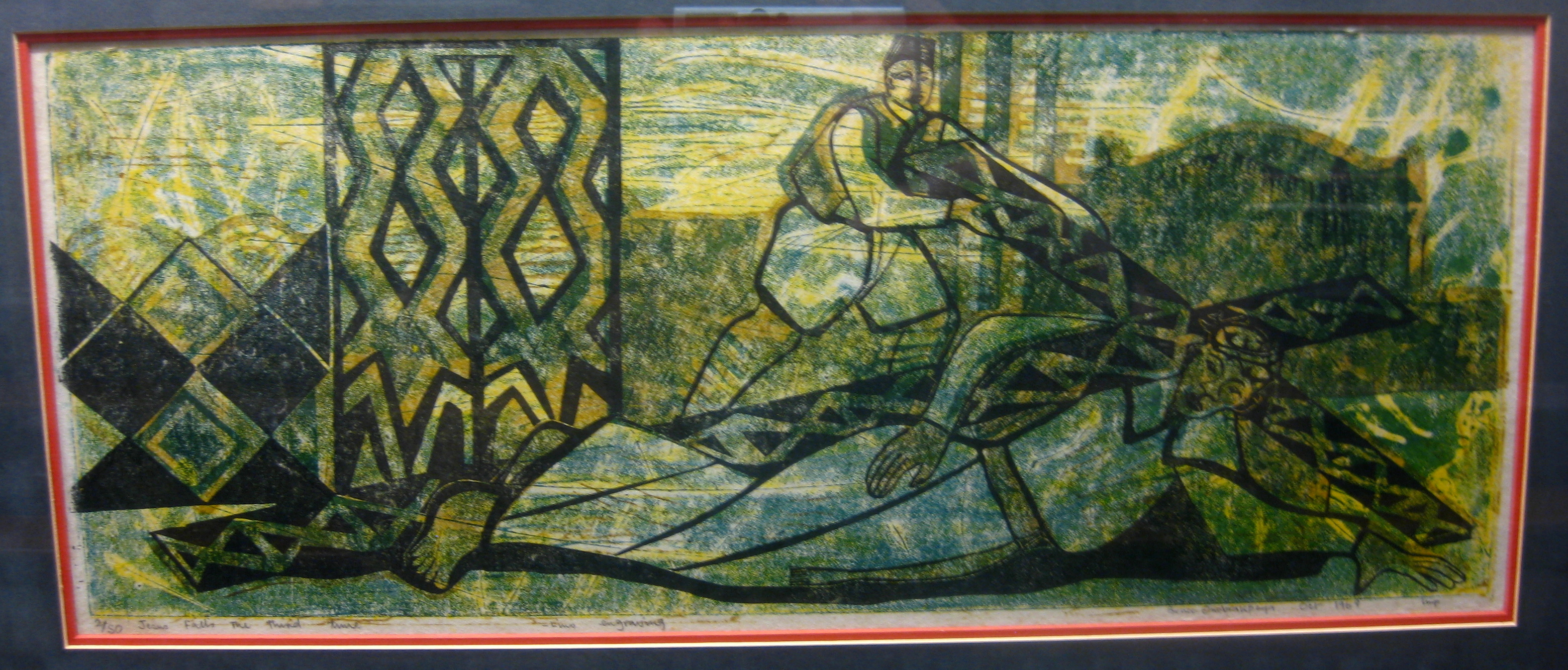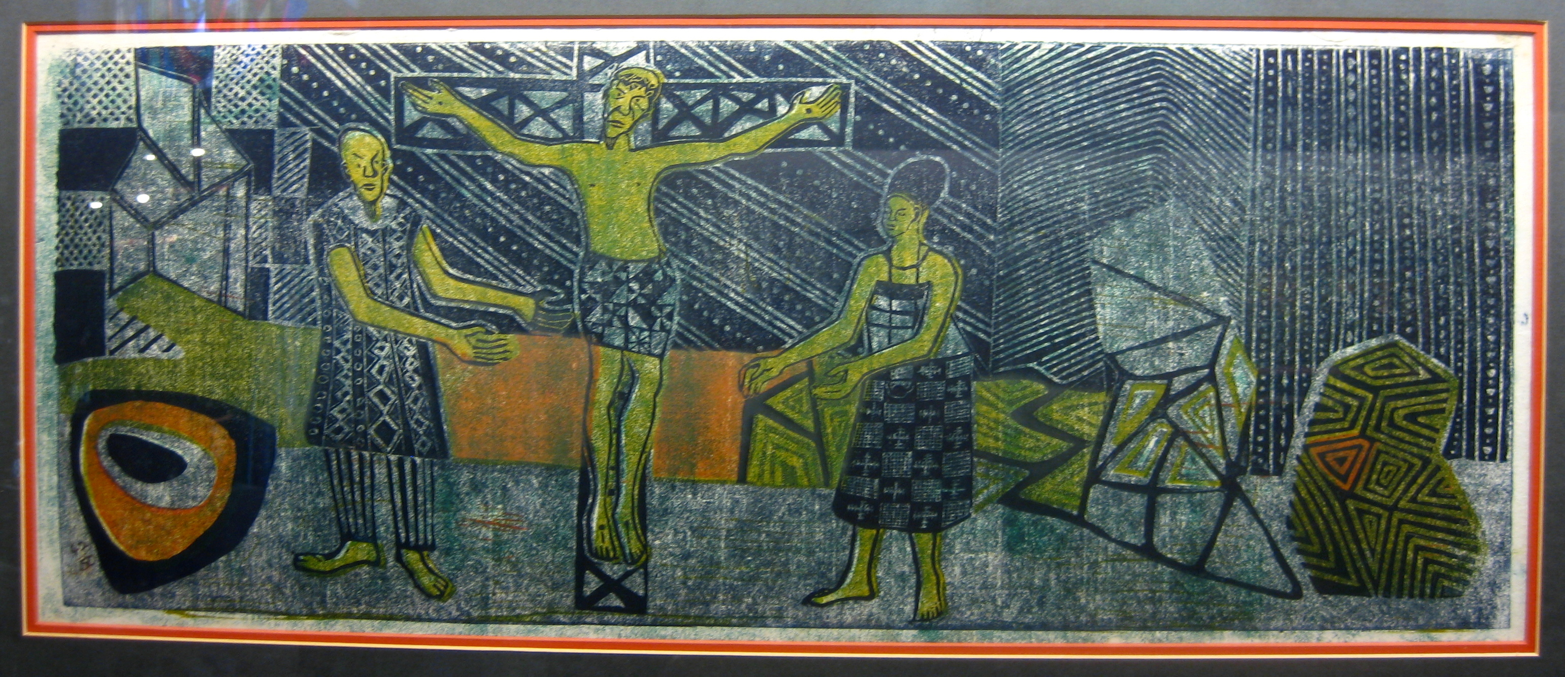 Other African artists have done their own versions of the Stations of the Cross, but one of the things that makes Onobrakpeya’s unique is his use of color and patterning. Greens, blues, reds, and yellows explode into the background, as do checkers, spirals, zigzags, dots, and other geometric shapes, repeated from the figures’ garments. Such abstraction adds to the mysticality of the event.