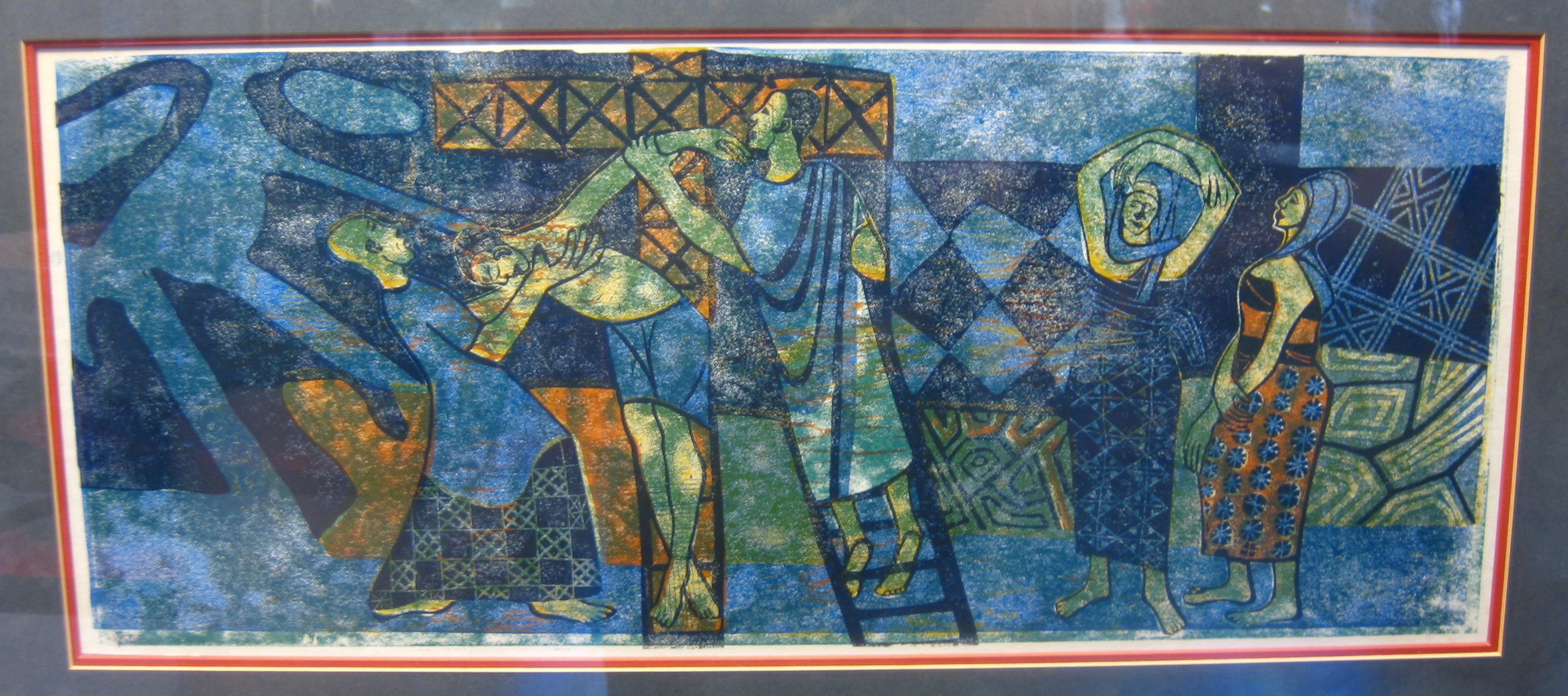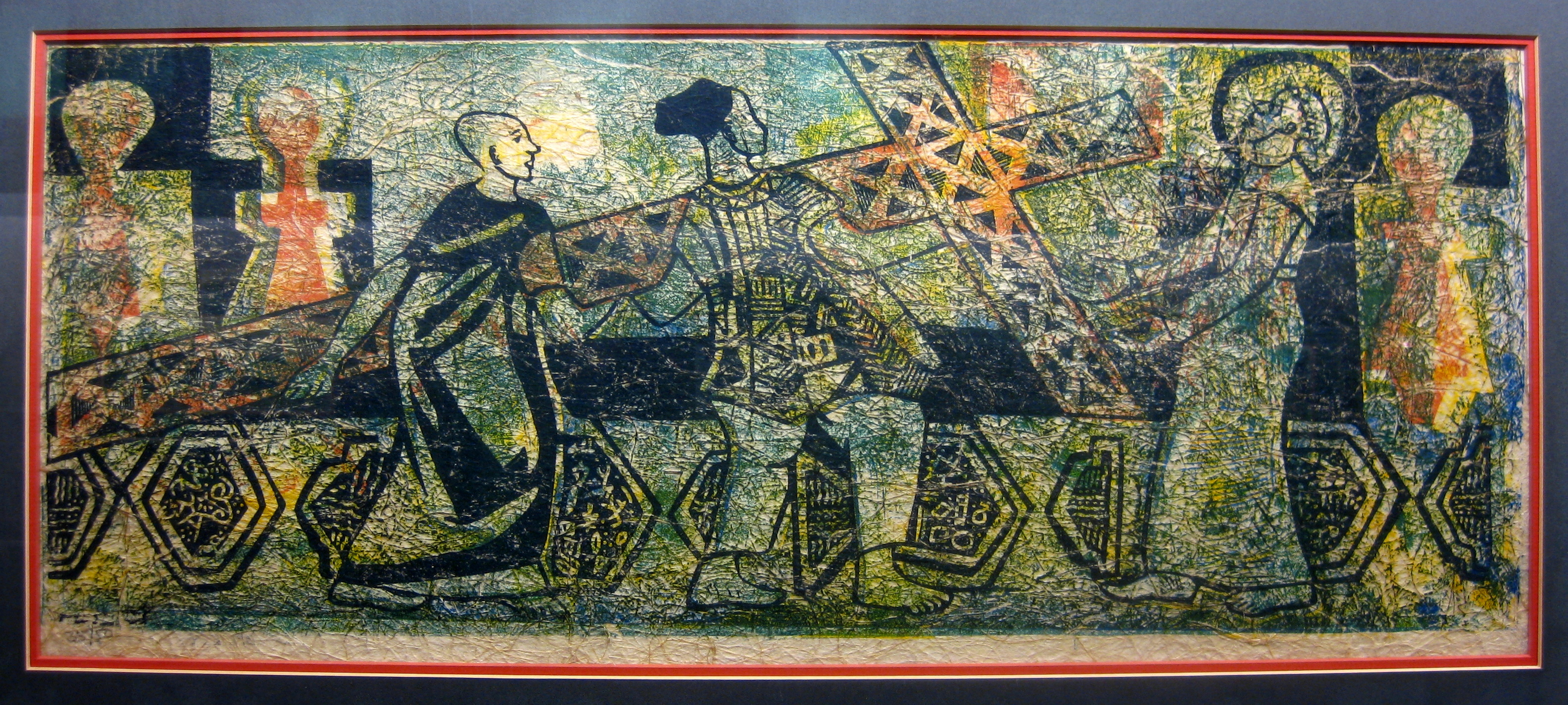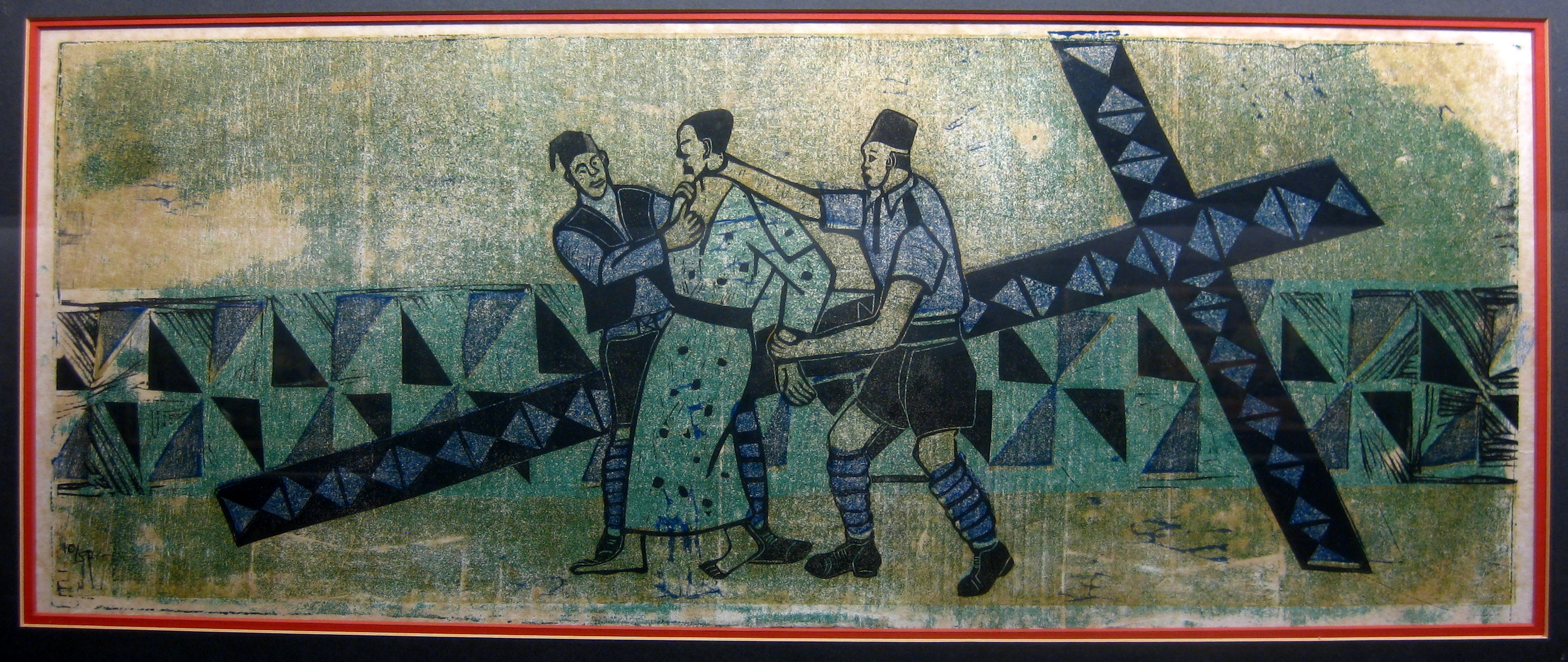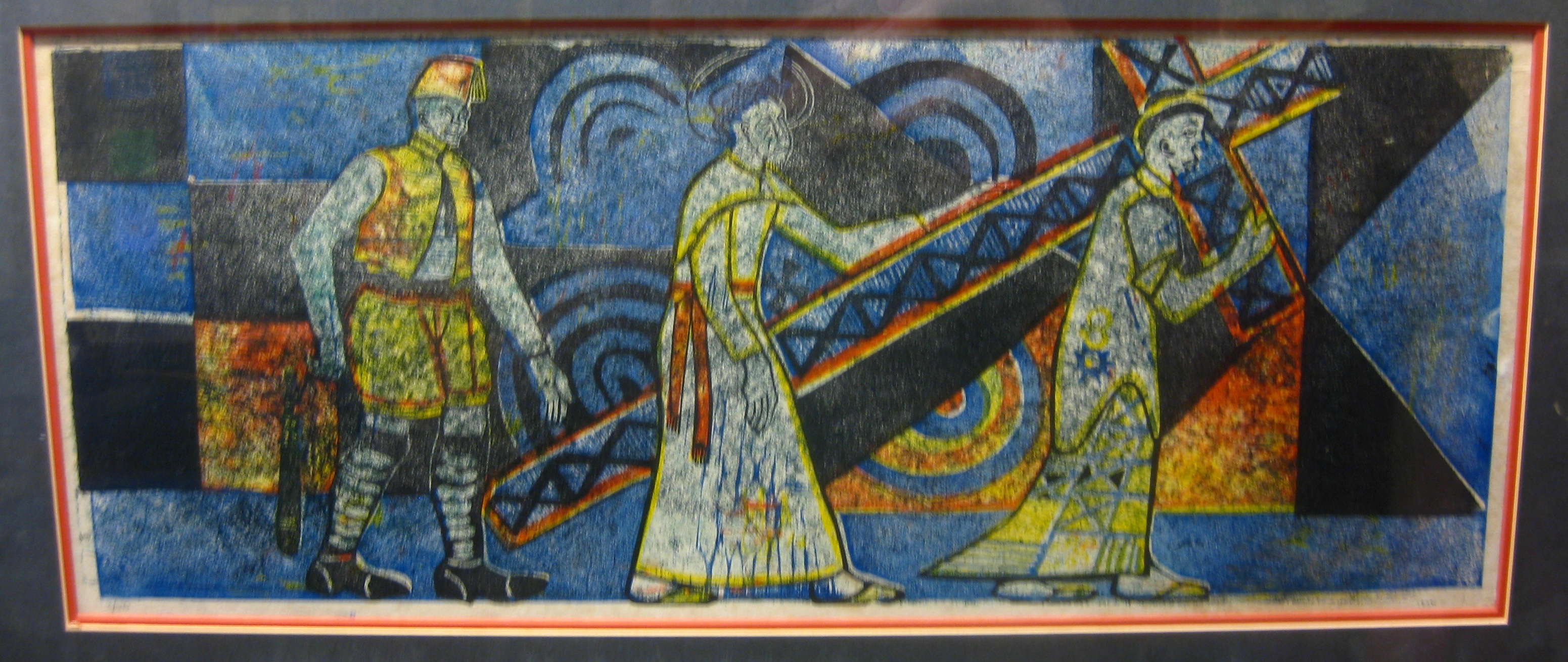 Other African artists have done their own versions of the Stations of the Cross, but one of the things that makes Onobrakpeya’s unique is his use of color and patterning. Greens, blues, reds, and yellows explode into the background, as do checkers, spirals, zigzags, dots, and other geometric shapes, repeated from the figures’ garments. Such abstraction adds to the mysticality of the event.