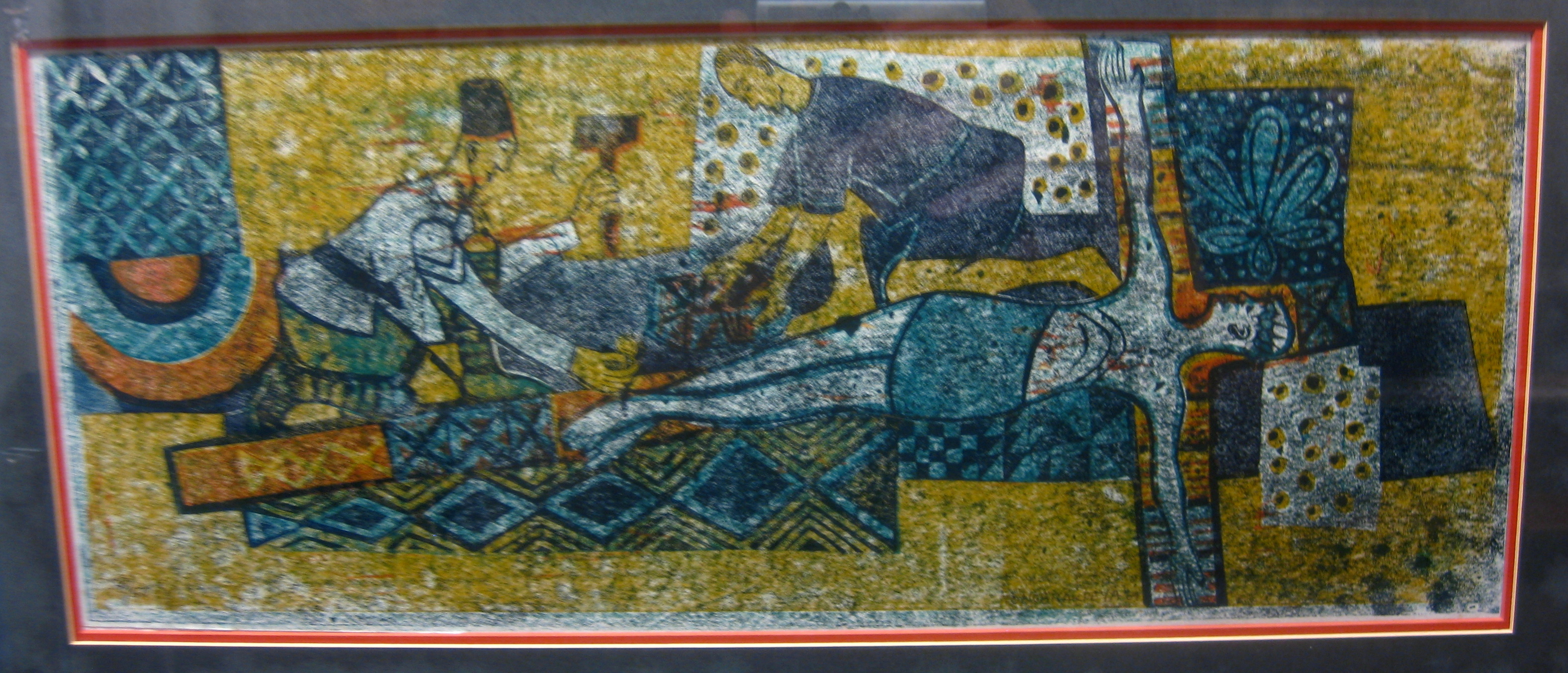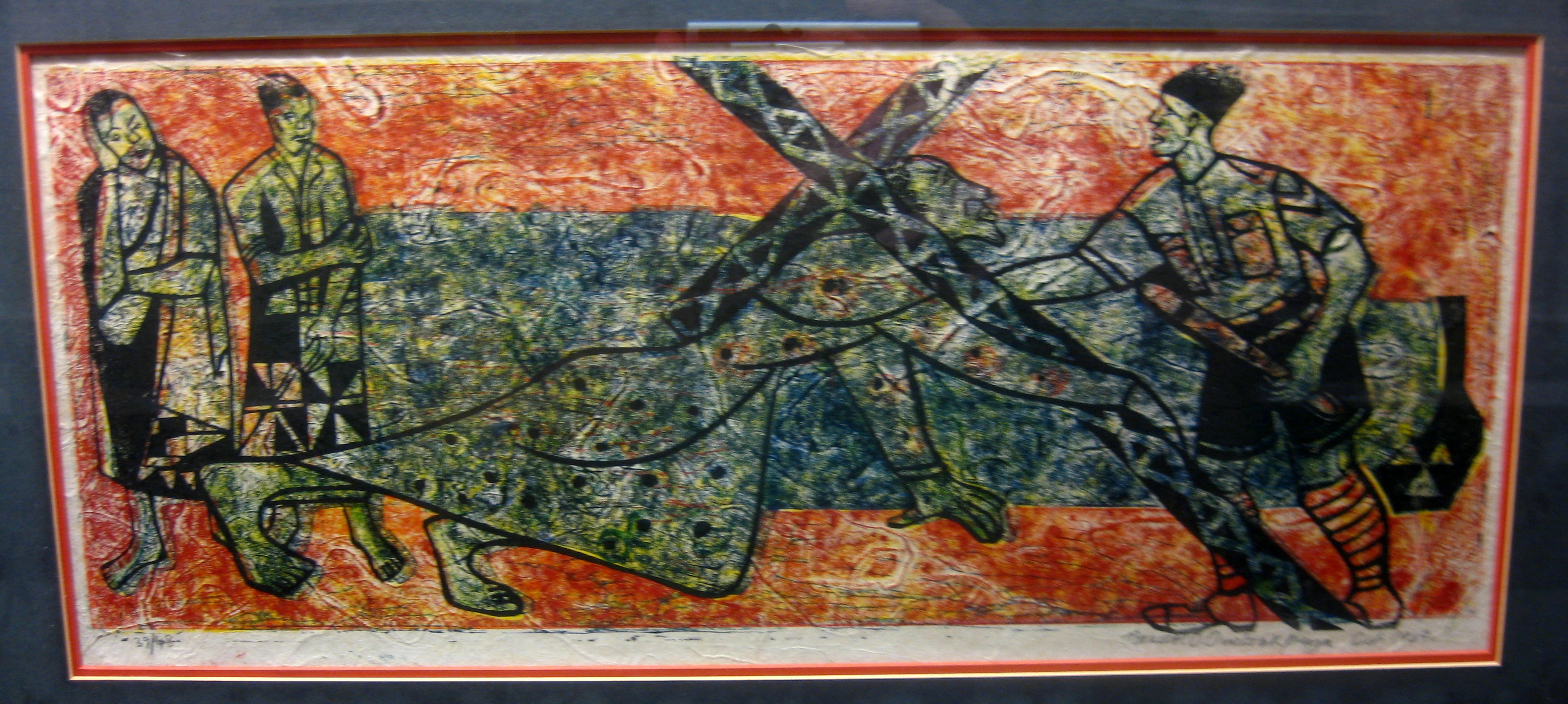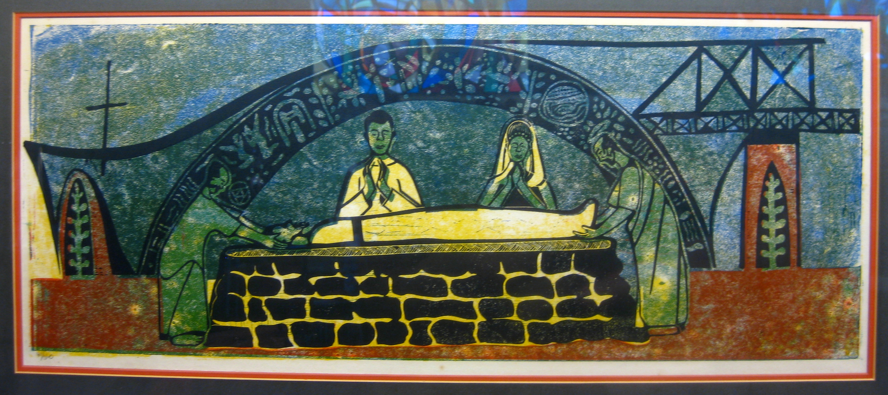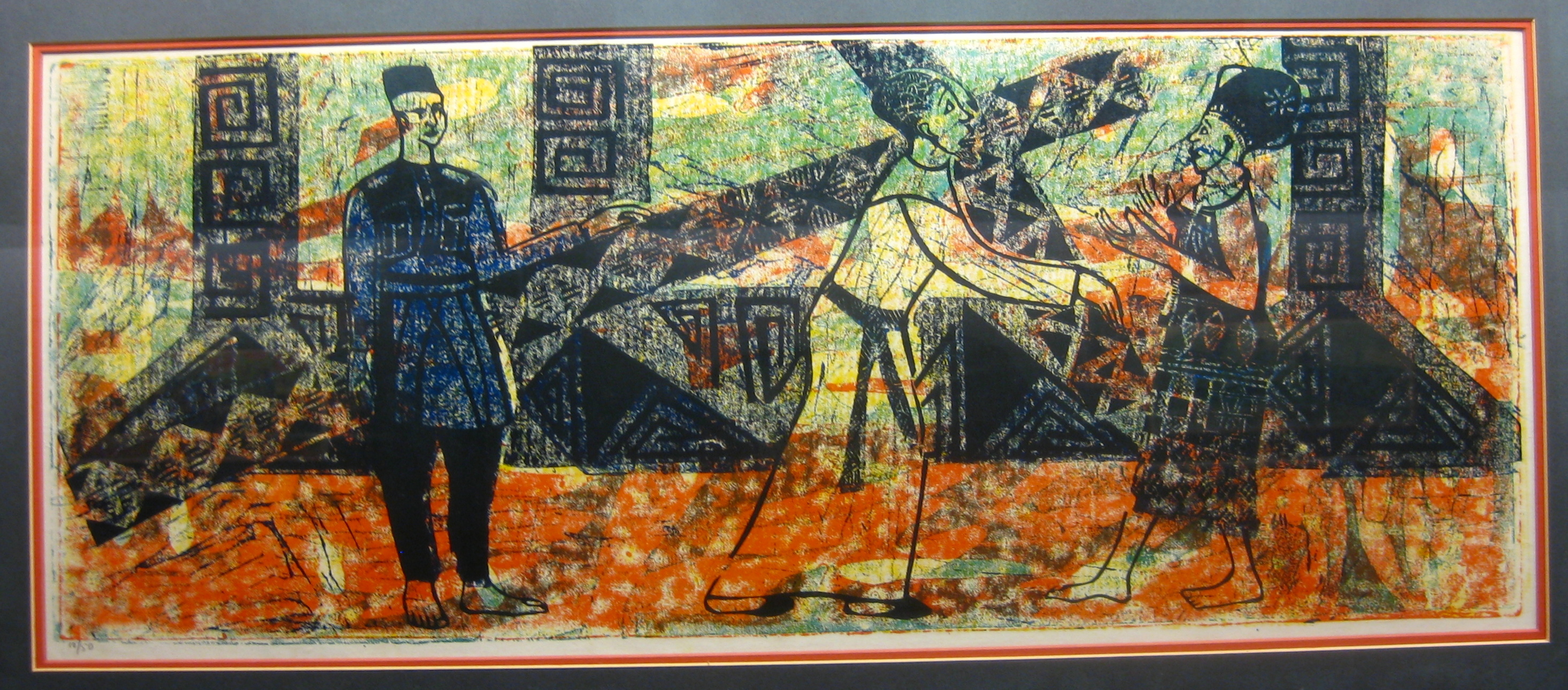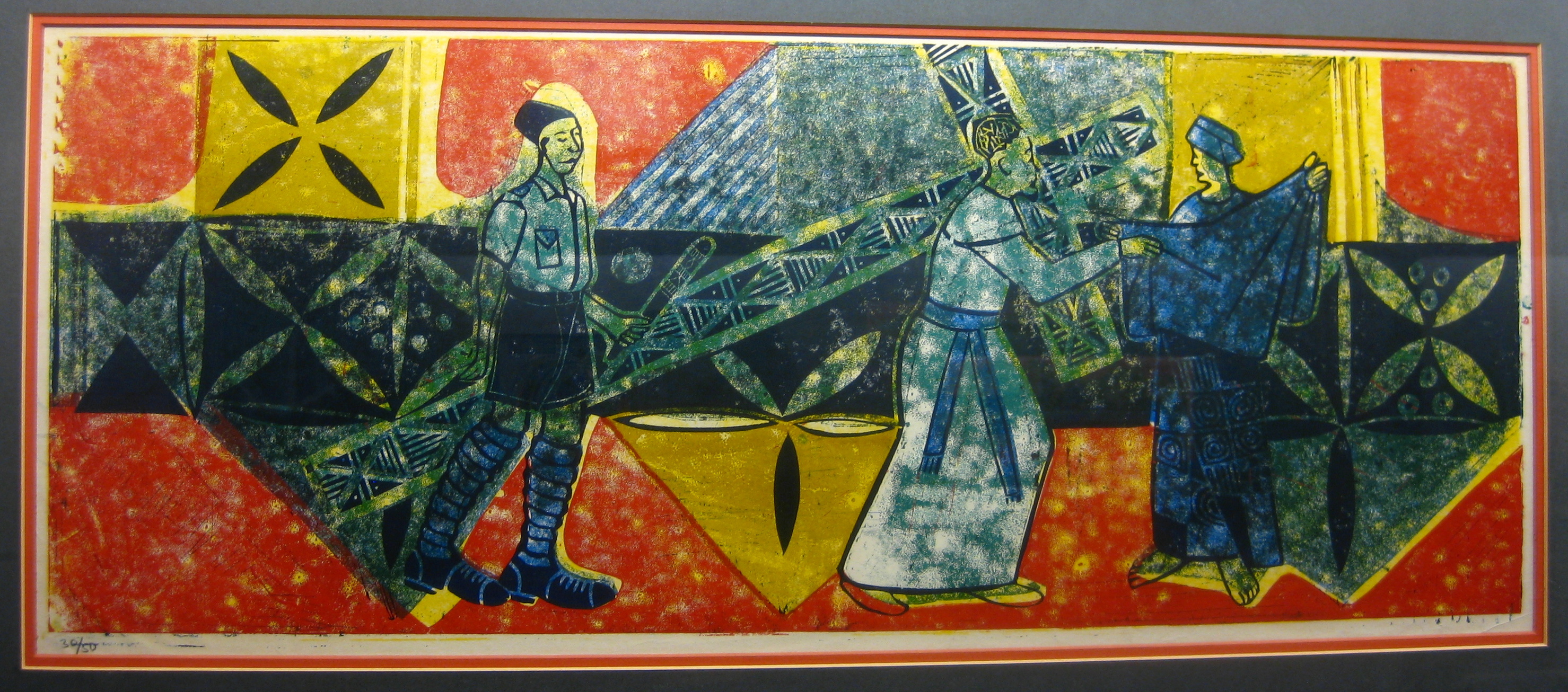 Other African artists have done their own versions of the Stations of the Cross, but one of the things that makes Onobrakpeya’s unique is his use of color and patterning. Greens, blues, reds, and yellows explode into the background, as do checkers, spirals, zigzags, dots, and other geometric shapes, repeated from the figures’ garments. Such abstraction adds to the mysticality of the event.