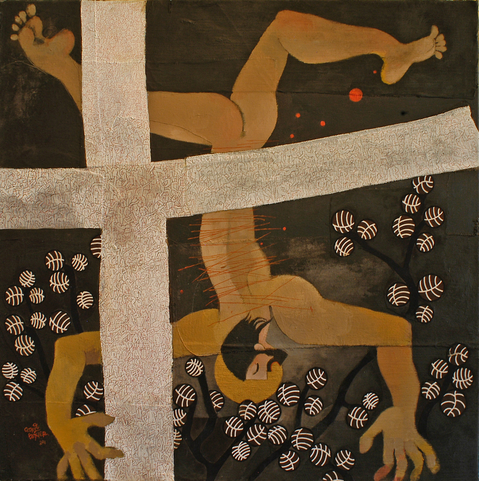 Every year since 2008 (excepting last year, due to ministerial transitions), Czerw has curated a Lenten art exhibition on behalf of Wesley Uniting Church in Perth, Australia, called Stations of the Cross. She selects fifteen Australian artists to participate, each one choosing a different station to depict. Jesus Striped and Stripped was Cedric Baxter’s 2011 contribution for Station 10, traditionally articulated as “Jesus is stripped of his garments.”