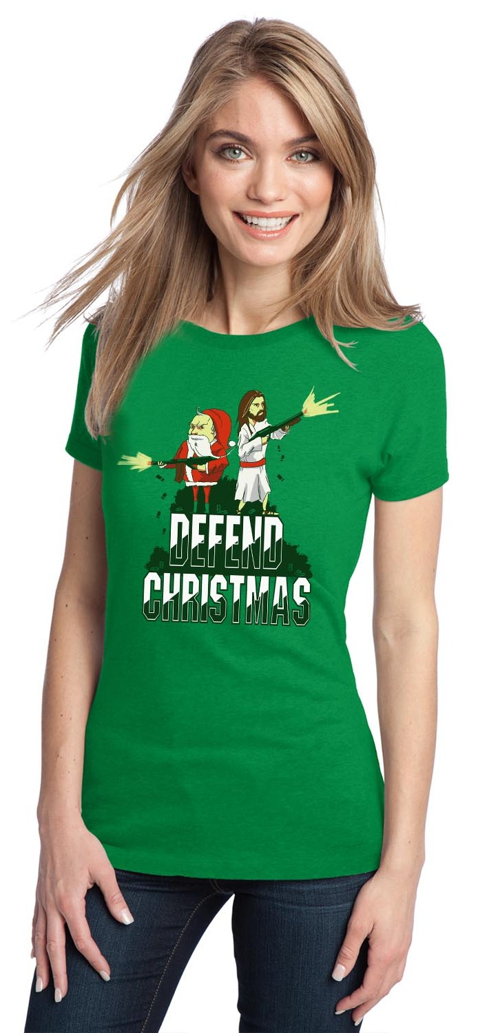 Seller’s description: Features “Santa and Jesus holding back the rising tide of pointy-toothed, Christmas-eating atheists and their liberal overlords in Americatown, USA.”